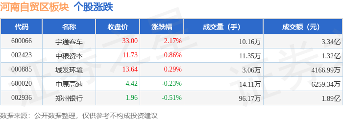 证券之星消息,12月10日河南自贸区板块较上一交易日上涨1.31%,宇通客车领涨。当日上证指数报收于3900.5,下跌0.23%。深证成指报收于13316.42,上涨0.29%。河南自贸区板块个股涨跌见下表: