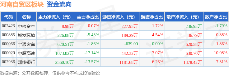 从资金流向上来看,当日河南自贸区板块主力资金净流出4470.73万元,游资资金净流入2041.18万元,散户资金净流入2429.55万元。河南自贸区板块个股资金流向见下表: