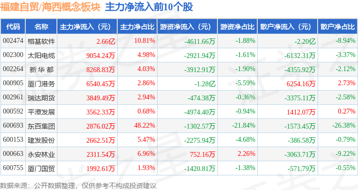 从资金流向上来看,当日福建自贸/海西概念板块主力资金净流出40.72亿元,游资资金净流入19.04万元,散户资金净流入40.72亿元。福建自贸/海西概念板块个股资金流向见下表: