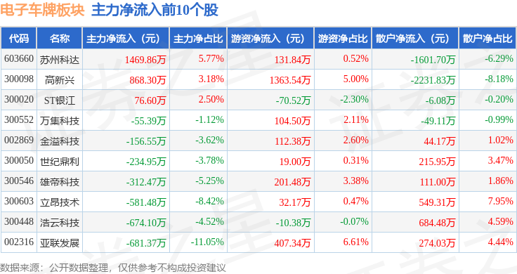 从资金流向上来看,当日电子车牌板块主力资金净流出1.94亿元,游资资金净流入6554.35万元,散户资金净流入1.29亿元。电子车牌板块个股资金流向见下表: