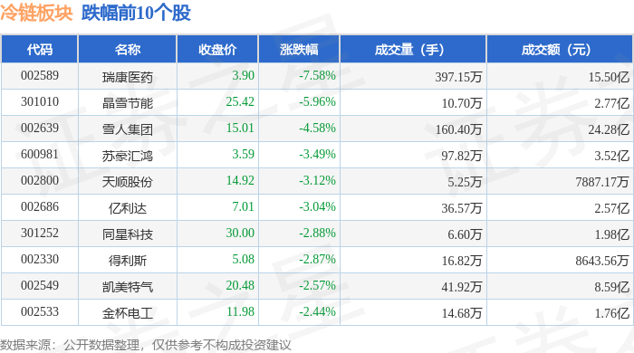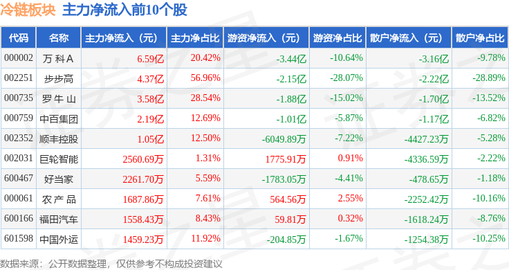 从资金流向上来看,当日冷链板块主力资金净流入3.4亿元,游资资金净流出10.01亿元,散户资金净流入6.61亿元。冷链板块个股资金流向见下表: