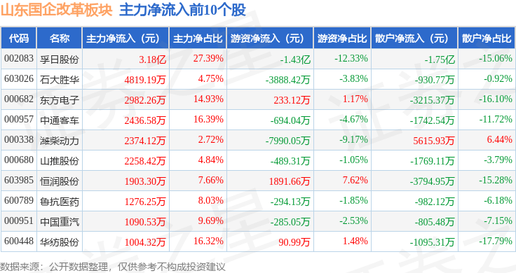 从资金流向上来看,当日山东国企改革板块主力资金净流出6.31亿元,游资资金净流出1.37亿元,散户资金净流入7.68亿元。山东国企改革板块个股资金流向见下表: