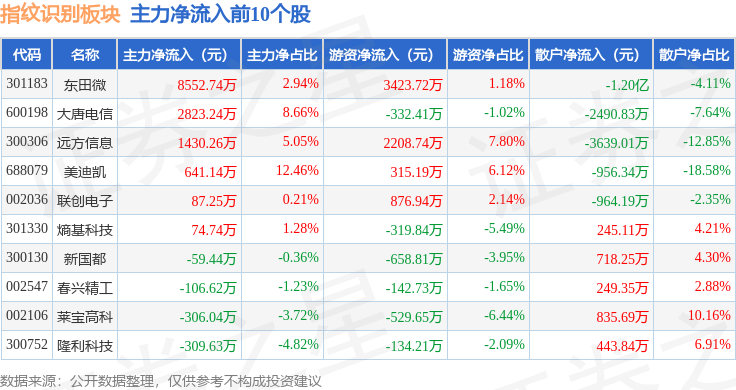 从资金流向上来看,当日指纹识别板块主力资金净流出17.4亿元,游资资金净流入3.63亿元,散户资金净流入13.77亿元。指纹识别板块个股资金流向见下表:
