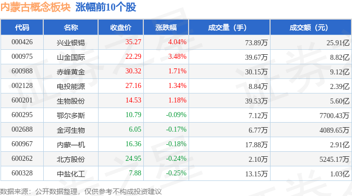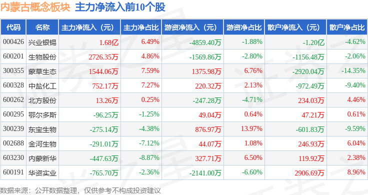 从资金流向上来看,当日内蒙古概念板块主力资金净流出5.62亿元,游资资金净流入1.39亿元,散户资金净流入4.23亿元。内蒙古概念板块个股资金流向见下表: