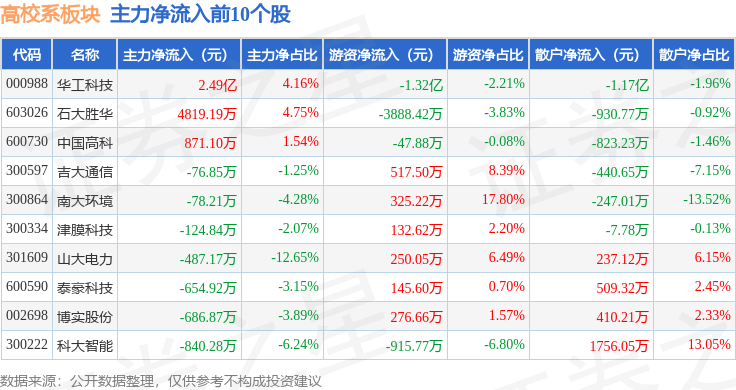 从资金流向上来看,当日高校系板块主力资金净流出1.53亿元,游资资金净流出1.74亿元,散户资金净流入3.27亿元。高校系板块个股资金流向见下表: