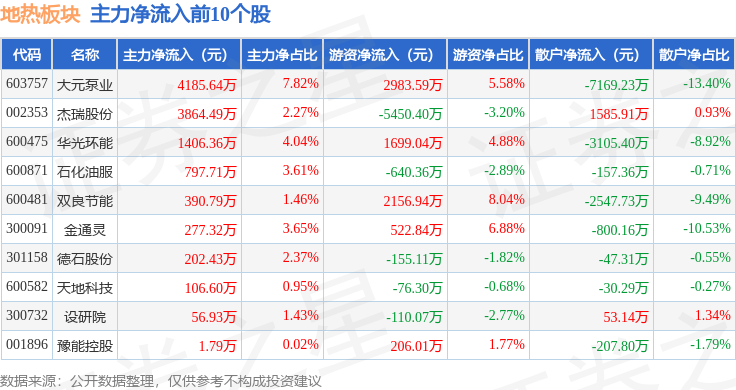 从资金流向上来看,当日地热板块主力资金净流出3.33亿元,游资资金净流出3292.97万元,散户资金净流入3.66亿元。地热板块个股资金流向见下表: