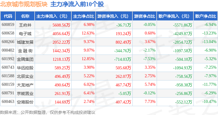 从资金流向上来看,当日北京城市规划板块主力资金净流出1188.21万元,游资资金净流入5632.24万元,散户资金净流出4444.03万元。北京城市规划板块个股资金流向见下表: