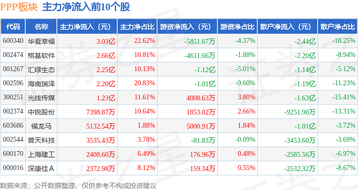 从资金流向上来看,当日PPP板块主力资金净流入3.5亿元,游资资金净流入1.51亿元,散户资金净流出5.01亿元。PPP板块个股资金流向见下表: