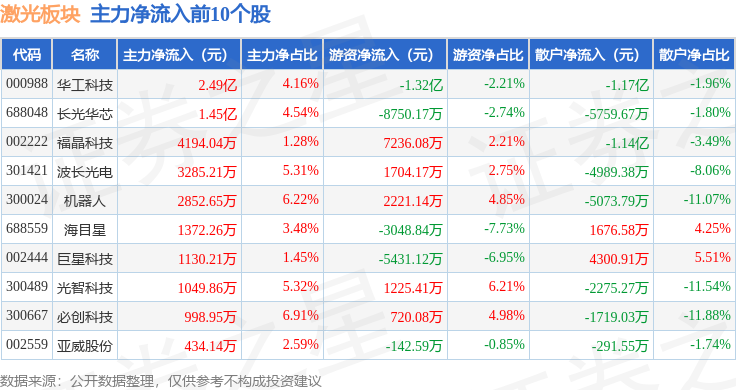 从资金流向上来看,当日激光板块主力资金净流出3.29亿元,游资资金净流入1784.42万元,散户资金净流入3.11亿元。激光板块个股资金流向见下表: