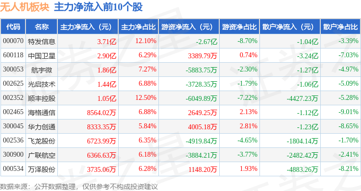 从资金流向上来看,当日无人机板块主力资金净流出16.09亿元,游资资金净流出1.22亿元,散户资金净流入17.31亿元。无人机板块个股资金流向见下表: