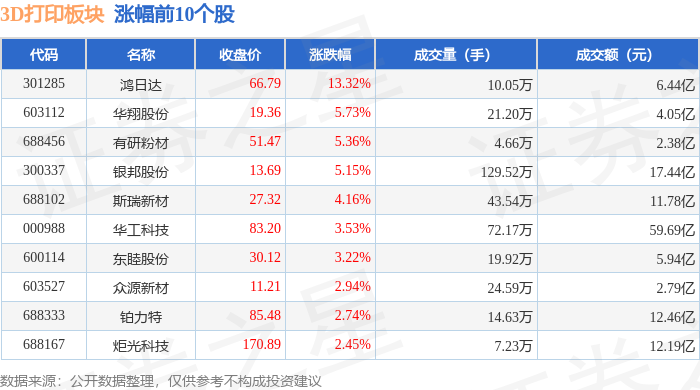 证券之星消息,12月10日3D打印板块较上一交易日上涨1.01%,鸿日达领涨。当日上证指数报收于3900.5,下跌0.23%。深证成指报收于13316.42,上涨0.29%。3D打印板块个股涨跌见下表: