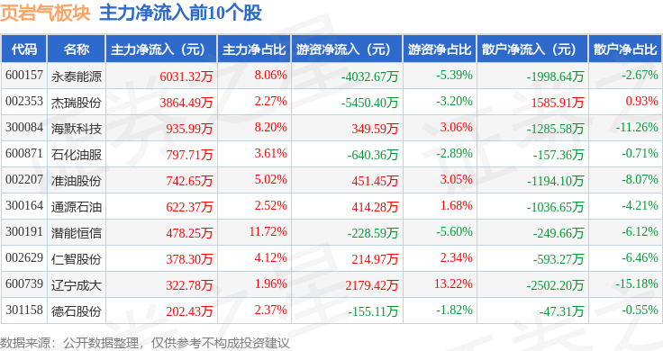从资金流向上来看,当日页岩气板块主力资金净流出2.92亿元,游资资金净流入337.99万元,散户资金净流入2.89亿元。页岩气板块个股资金流向见下表: