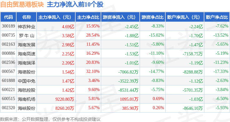 从资金流向上来看,当日自由贸易港板块主力资金净流入22.56亿元,游资资金净流出9.12亿元,散户资金净流出13.44亿元。自由贸易港板块个股资金流向见下表: