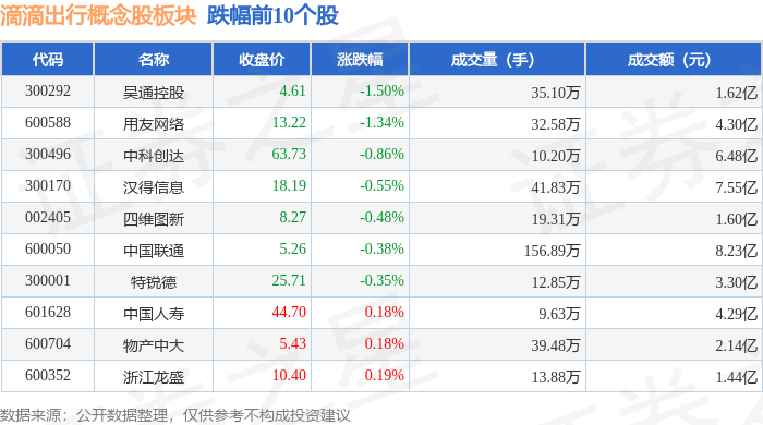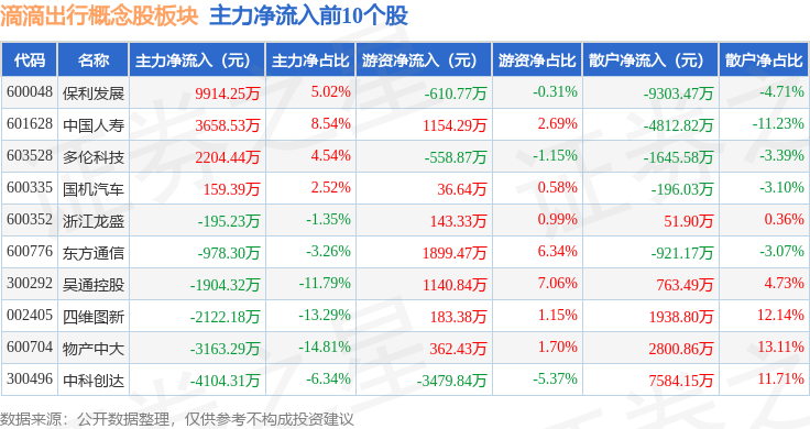 从资金流向上来看,当日滴滴出行概念股板块主力资金净流出2.03亿元,游资资金净流入5009.05万元,散户资金净流入1.53亿元。滴滴出行概念股板块个股资金流向见下表: