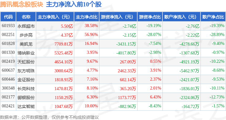从资金流向上来看,当日腾讯概念股板块主力资金净流出10.56亿元,游资资金净流入2.18亿元,散户资金净流入8.38亿元。腾讯概念股板块个股资金流向见下表: