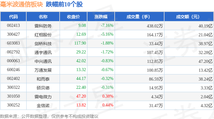 证券之星消息,12月10日毫米波通信板块较上一交易日下跌0.18%,雷科防务领跌。当日上证指数报收于3900.5,下跌0.23%。深证成指报收于13316.42,上涨0.29%。毫米波通信板块个股涨跌见下表: