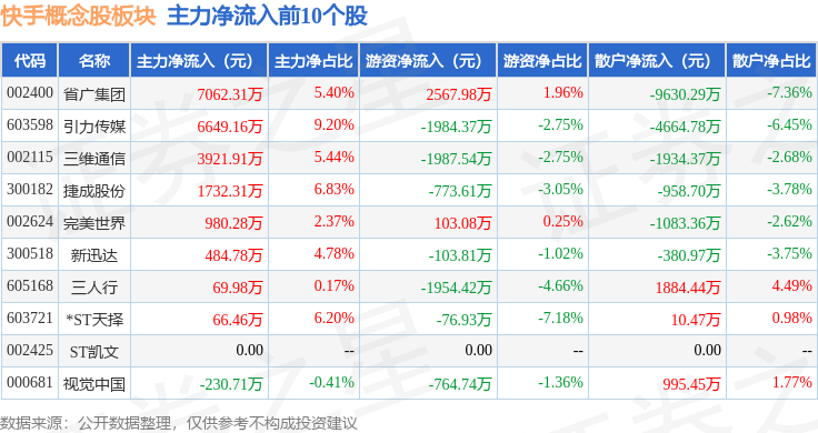 从资金流向上来看,当日快手概念股板块主力资金净流出5.79亿元,游资资金净流入4684.28万元,散户资金净流入5.32亿元。快手概念股板块个股资金流向见下表: