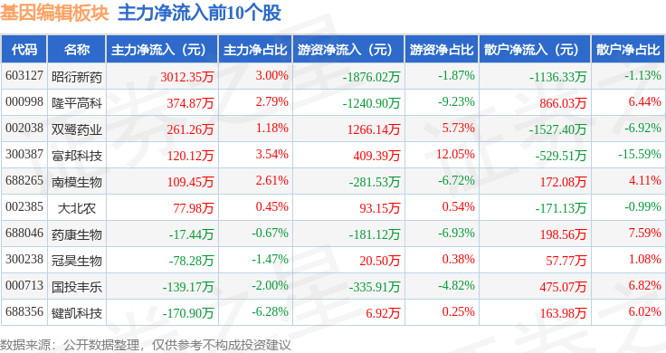 从资金流向上来看,当日基因编辑板块主力资金净流出1.49亿元,游资资金净流入1.33亿元,散户资金净流入1556.48万元。基因编辑板块个股资金流向见下表: