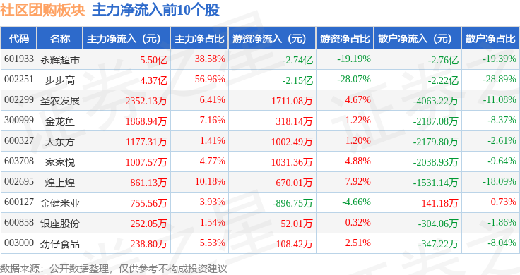 从资金流向上来看,当日社区团购板块主力资金净流入6.25亿元,游资资金净流出3.62亿元,散户资金净流出2.63亿元。社区团购板块个股资金流向见下表: