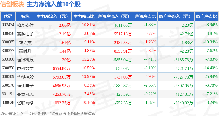 从资金流向上来看,当日信创板块主力资金净流出40.38亿元,游资资金净流入8.58亿元,散户资金净流入31.8亿元。信创板块个股资金流向见下表: