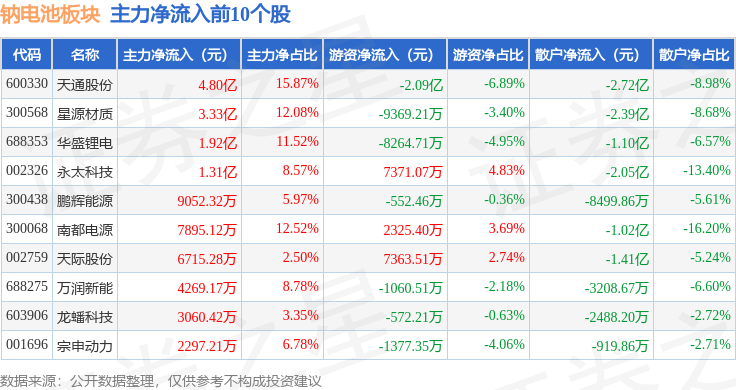 从资金流向上来看,当日钠电池板块主力资金净流出7.01亿元,游资资金净流入3637.24万元,散户资金净流入6.64亿元。钠电池板块个股资金流向见下表: