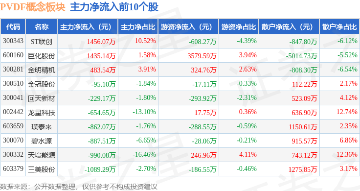从资金流向上来看,当日PVDF概念板块主力资金净流出3.45亿元,游资资金净流入7487.08万元,散户资金净流入2.7亿元。PVDF概念板块个股资金流向见下表: