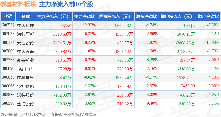 从资金流向上来看,当日碳基材料板块主力资金净流出3.0亿元,游资资金净流出1.03亿元,散户资金净流入4.03亿元。碳基材料板块个股资金流向见下表: