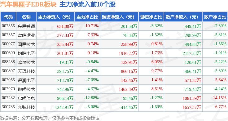 从资金流向上来看,当日汽车黑匣子EDR板块主力资金净流出2.72亿元,游资资金净流入8147.73万元,散户资金净流入1.9亿元。汽车黑匣子EDR板块个股资金流向见下表: