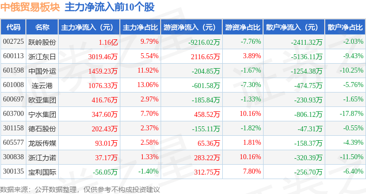 从资金流向上来看,当日中俄贸易板块主力资金净流入6035.2万元,游资资金净流出6358.96万元,散户资金净流入323.75万元。中俄贸易板块个股资金流向见下表: