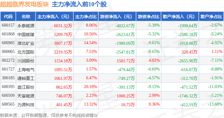 从资金流向上来看,当日超超临界发电板块主力资金净流出2.29亿元,游资资金净流入218.29万元,散户资金净流入2.26亿元。超超临界发电板块个股资金流向见下表: