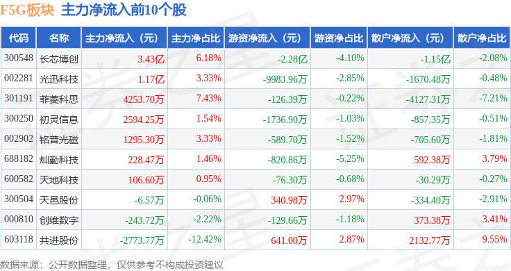 从资金流向上来看,当日F5G板块主力资金净流入990.41万元,游资资金净流出2.98亿元,散户资金净流入2.88亿元。F5G板块个股资金流向见下表: