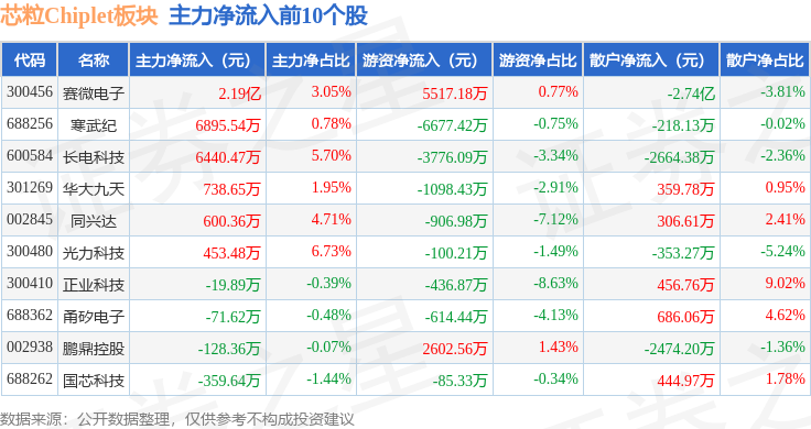 从资金流向上来看,当日芯粒Chiplet板块主力资金净流出6435.98万元,游资资金净流出3421.07万元,散户资金净流入9857.05万元。芯粒Chiplet板块个股资金流向见下表: