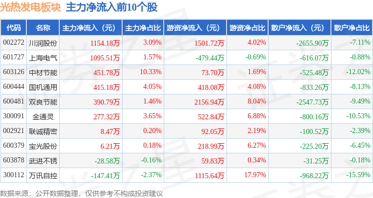 从资金流向上来看,当日光热发电板块主力资金净流出1.8亿元,游资资金净流入1.54亿元,散户资金净流入2569.77万元。光热发电板块个股资金流向见下表: