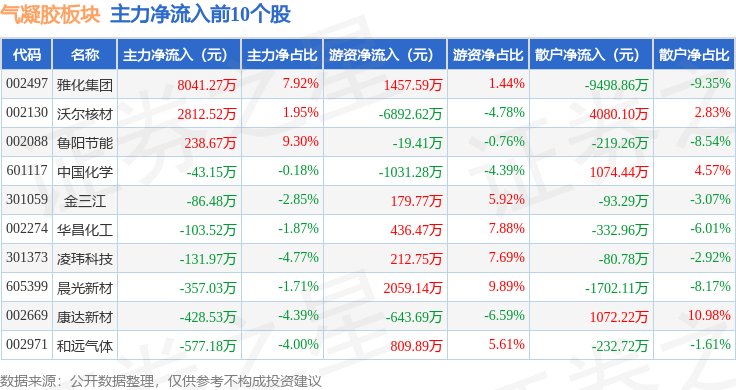 从资金流向上来看,当日气凝胶板块主力资金净流出886.93万元,游资资金净流出7549.75万元,散户资金净流入8436.68万元。气凝胶板块个股资金流向见下表: