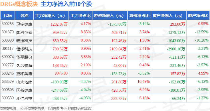 从资金流向上来看,当日DRGs概念板块主力资金净流出3.5亿元,游资资金净流入2222.07万元,散户资金净流入3.27亿元。DRGs概念板块个股资金流向见下表: