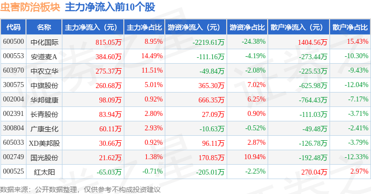 从资金流向上来看,当日虫害防治板块主力资金净流出1.21亿元,游资资金净流入1061.68万元,散户资金净流入1.1亿元。虫害防治板块个股资金流向见下表: