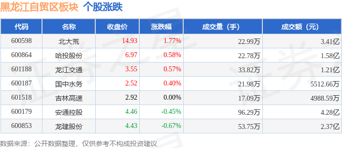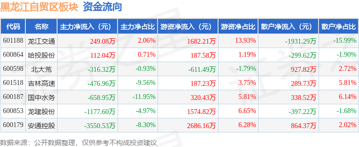 从资金流向上来看,当日黑龙江自贸区板块主力资金净流出5819.23万元,游资资金净流入6026.92万元,散户资金净流出207.68万元。黑龙江自贸区板块个股资金流向见下表: