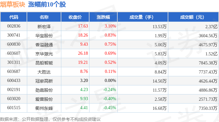 证券之星消息,12月10日烟草板块较上一交易日下跌0.58%,慧辰股份领跌。当日上证指数报收于3900.5,下跌0.23%。深证成指报收于13316.42,上涨0.29%。烟草板块个股涨跌见下表: