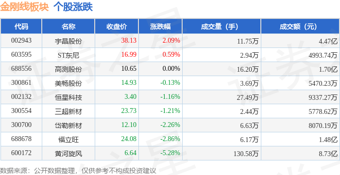 证券之星消息,12月10日金刚线板块较上一交易日下跌1.4%,黄河旋风领跌。当日上证指数报收于3900.5,下跌0.23%。深证成指报收于13316.42,上涨0.29%。金刚线板块个股涨跌见下表: