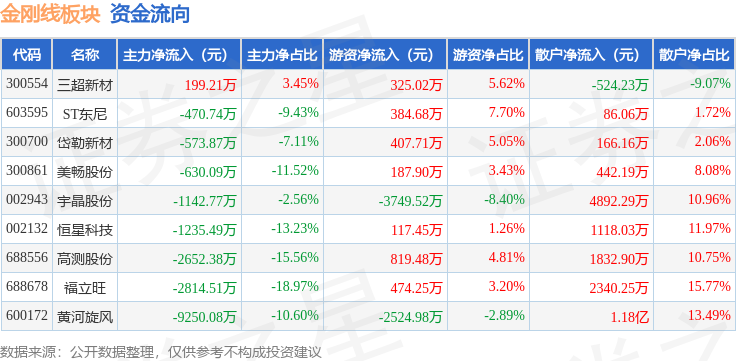 从资金流向上来看,当日金刚线板块主力资金净流出1.86亿元,游资资金净流出3558.0万元,散户资金净流入2.21亿元。金刚线板块个股资金流向见下表: