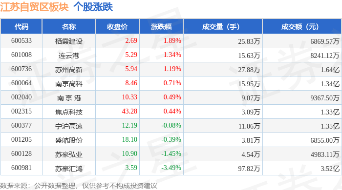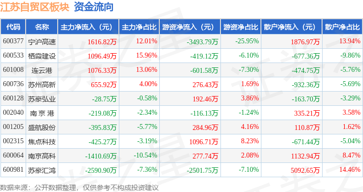 从资金流向上来看,当日江苏自贸区板块主力资金净流出624.96万元,游资资金净流出5004.07万元,散户资金净流入5629.03万元。江苏自贸区板块个股资金流向见下表: