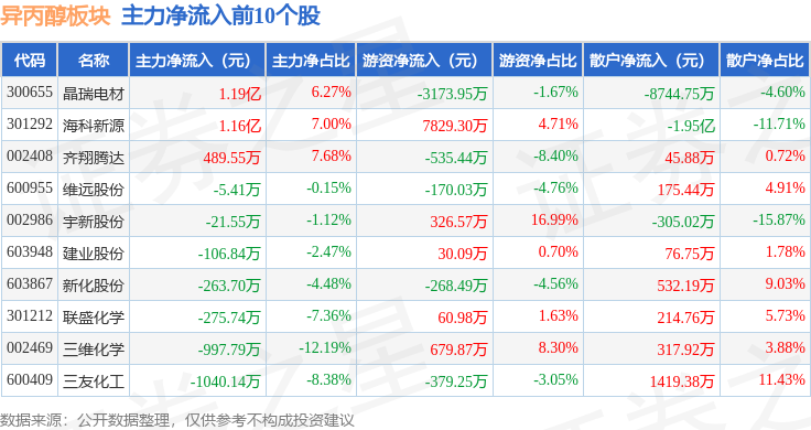 从资金流向上来看,当日异丙醇板块主力资金净流入1.42亿元,游资资金净流入5504.99万元,散户资金净流出1.98亿元。异丙醇板块个股资金流向见下表: