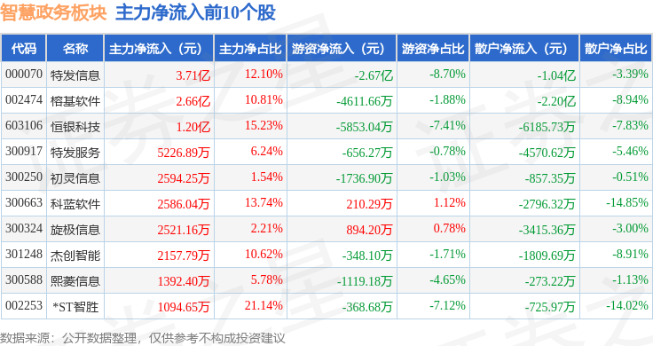 从资金流向上来看,当日智慧政务板块主力资金净流出25.87亿元,游资资金净流出4.72亿元,散户资金净流入30.58亿元。智慧政务板块个股资金流向见下表: