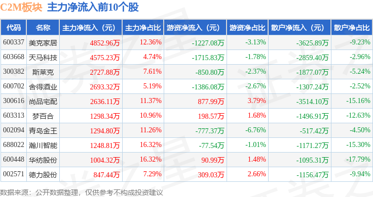 从资金流向上来看,当日C2M板块主力资金净流出6813.71万元,游资资金净流出2.15亿元,散户资金净流入2.84亿元。C2M板块个股资金流向见下表: