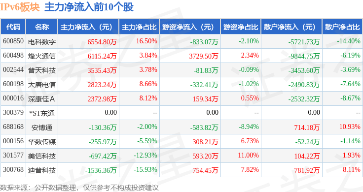 从资金流向上来看,当日IPv6板块主力资金净流出19.76亿元,游资资金净流入5.77亿元,散户资金净流入13.99亿元。IPv6板块个股资金流向见下表: