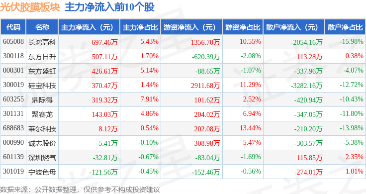从资金流向上来看,当日光伏胶膜板块主力资金净流出4.57亿元,游资资金净流入2865.67万元,散户资金净流入4.28亿元。光伏胶膜板块个股资金流向见下表: