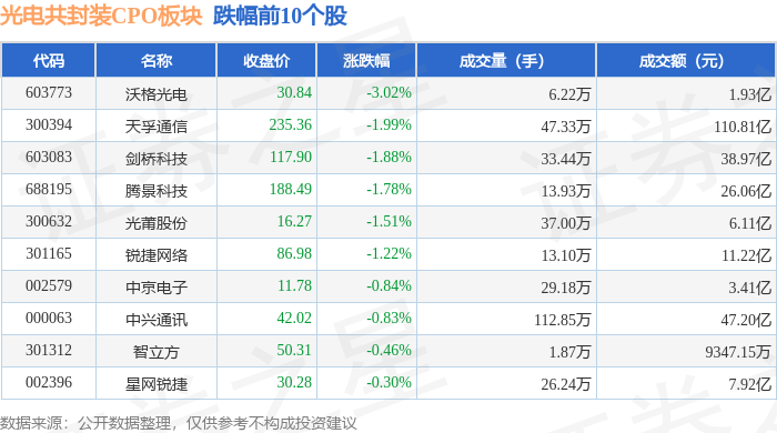 从资金流向上来看,当日光电共封装CPO板块主力资金净流出9.92亿元,游资资金净流出5.67亿元,散户资金净流入15.59亿元。光电共封装CPO板块个股资金流向见下表: