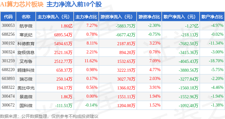 从资金流向上来看,当日AI算力芯片板块主力资金净流出4.86亿元,游资资金净流入3.44亿元,散户资金净流入1.42亿元。AI算力芯片板块个股资金流向见下表: