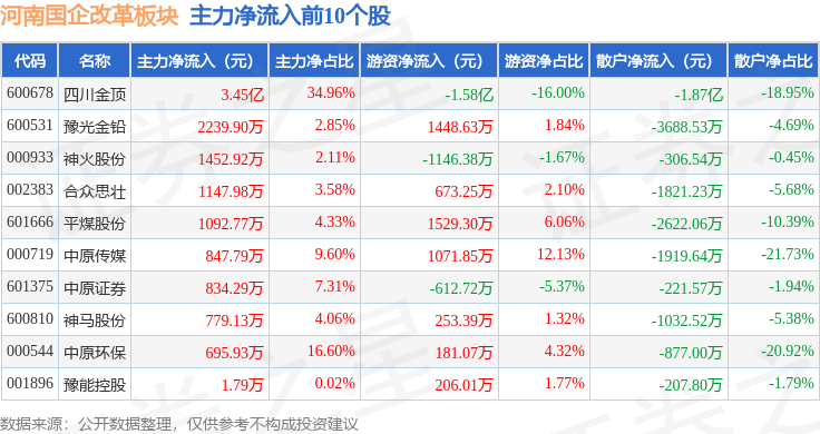 从资金流向上来看,当日河南国企改革板块主力资金净流入1.11亿元,游资资金净流出1.46亿元,散户资金净流入3474.65万元。河南国企改革板块个股资金流向见下表: