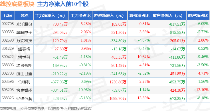 从资金流向上来看,当日线控底盘板块主力资金净流出7708.43万元,游资资金净流入2124.54万元,散户资金净流入5583.89万元。线控底盘板块个股资金流向见下表: